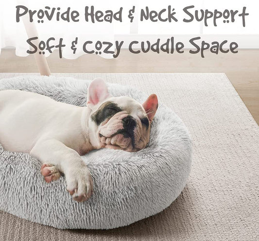 • Donut Dog Bed Faux Fur Fluffy Calming Sofa for Small Dogs, Soft & Plush anti Anxiety Pet Couch for Dogs, Machine Washable Coco Pet Bed with Non-Slip Bottom, 23"X23"X6" Grey